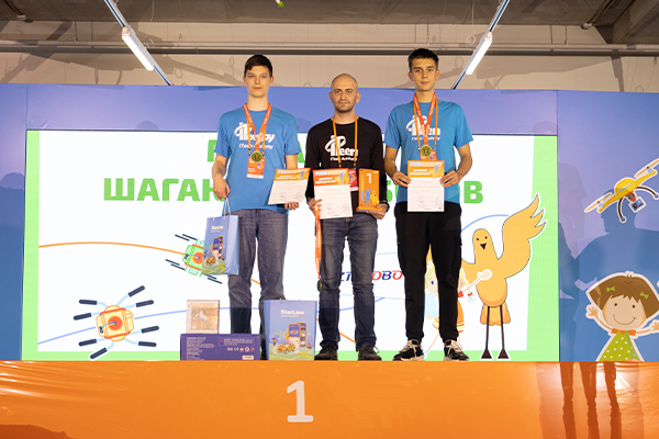 На первую ступень пьедестала поднялся дуэт Романа Ткачука и Кирилла Ткачука. Робот ребят показал лучший результат на трассе категории «Марафон шагающих роботов».
